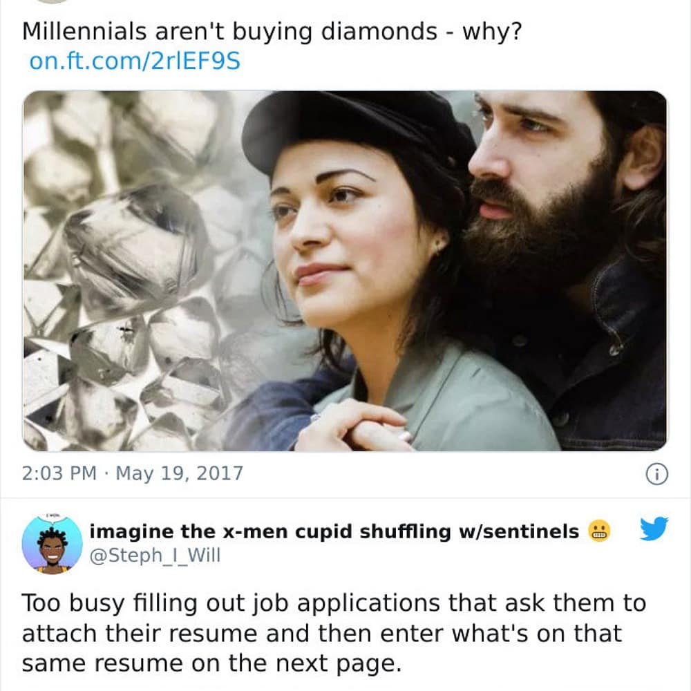 A tweet asked why millennials aren’t purchasing diamonds. A reply below answered, “they are busy.” They are busy applying for jobs, filling out job applications in a tedious way – filling what’s already on their resume on another page.